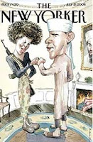 While the New Yorker decides to play a “joke” on everyone – hoping that readers will peel back the cover of their latest issue to read what’s between the ads in order to get at the clever punch lines – the conservative right gets it immediately! They love the cartoon, espousing it as an accurate portrait of all things considered Hussein about the Obamas. That cartoon image may work well for the New Yorker as a viral ad for its own publication but, because broadcast media has already decapitated it from the body of intellect that explains it, that visual image will far outdistance any literary efforts at humor. Here in the Midwest and across the nation most people just get another free dose of fear-marketing: Osama, Obama, flag-burning, fist-pumping, foreign, militant, danger.
